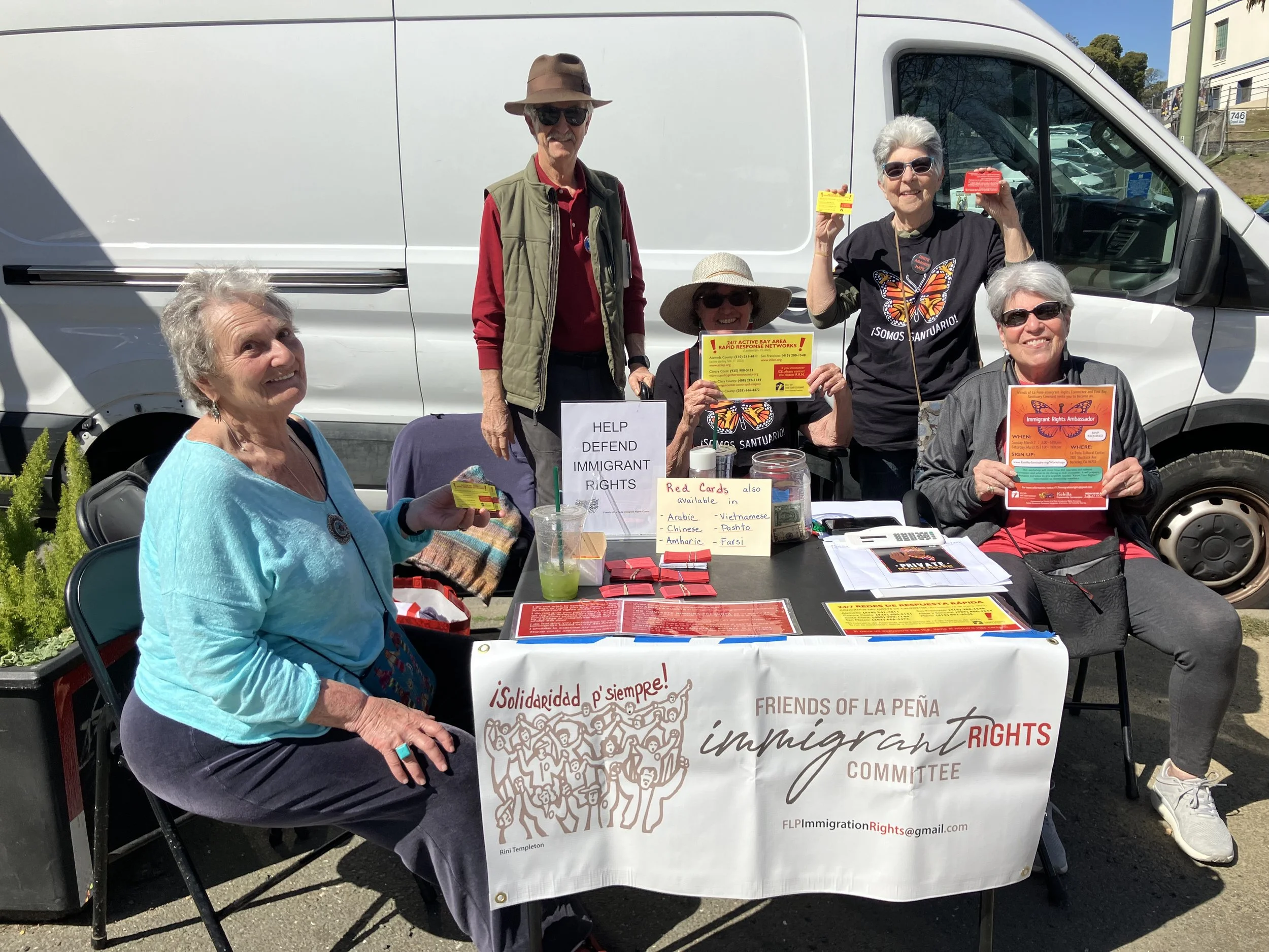 Volunteers have also been staffing tables in Oakland and Berkeley to distribute Red & Yellow Cards in Spanish and other languages. So far we have distributed over 110,000 cards. Volunteers are needed to help staff tables and distribute cards.